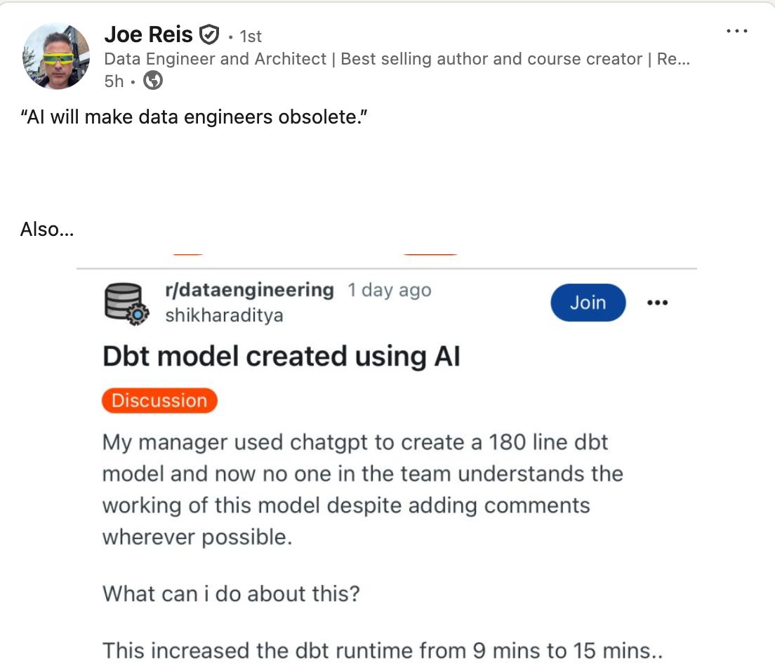 But it deserves the final spot because in the era of AI, it’s more relevant than ever. Just because we can move faster, deploy bigger models, or automate pipelines doesn’t mean the work is actually useful. The hardest part of data engineering was never “can we do it?” but “does it matter?”