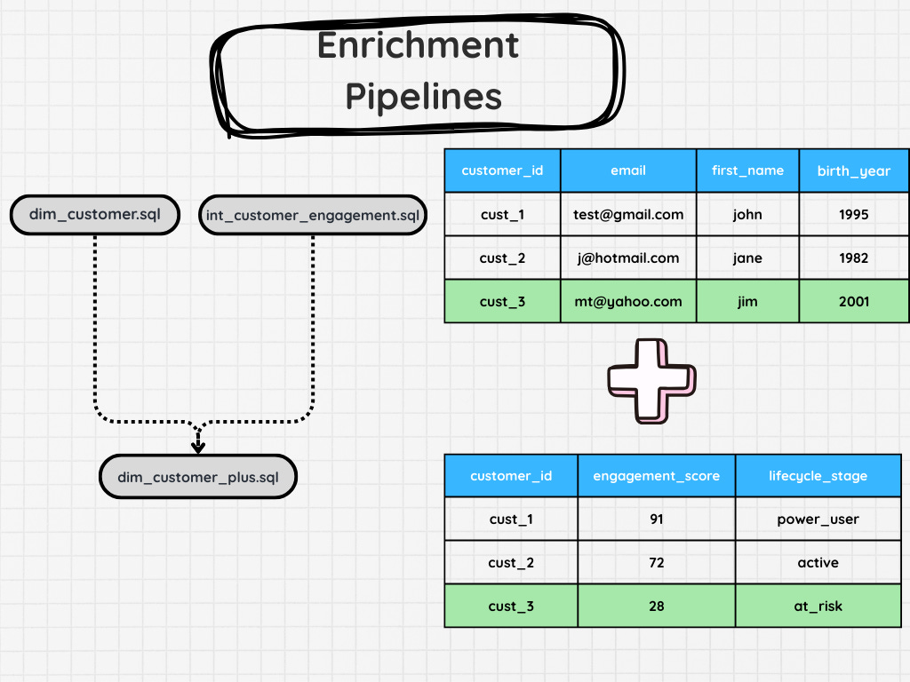 Not all the data you need will exist in your core tables. In turn, you might have to enrich your data. This will often need to be a separate pipeline.