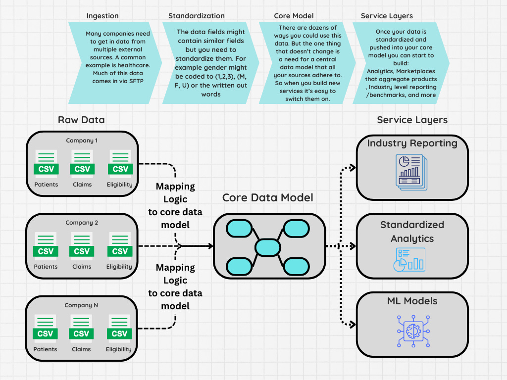 Some of the first pipelines I helped build and manage were focused on taking data sets from dozens of companies and standardizing them to a single core data model. In particular, this involved getting data via SFTP in different formats, including comma-delimited, pipe-delimited, XML, and even positional files, where you had to have a separate file that would define which columns contained which rows.
