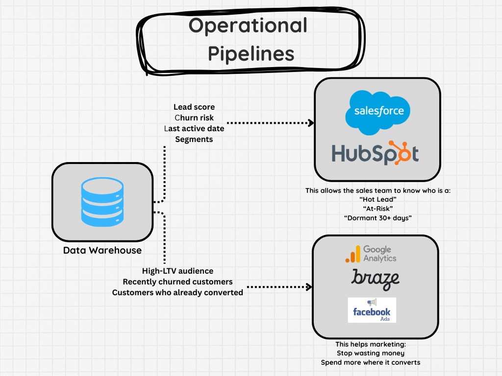 Once you’ve built your data warehouse, it’s not uncommon to need to ingest data back into operational systems. A common example I have seen here is segmentation in Salesforce. Many companies I’ve worked with export their data out, enrich it, then ingest it back into Salesforce.
